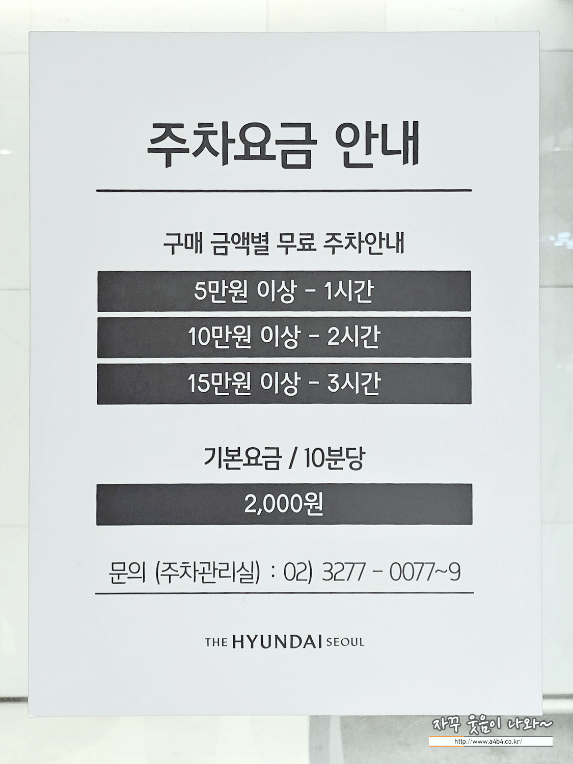 - 주차요금 안내에는 15만원 최대 3시간 무료주차 안내되어 있느데, 예전 명품매장에서 구입하니 종일 주차처리해 주셨는데 지금도 유효한지는 모르겠네요.