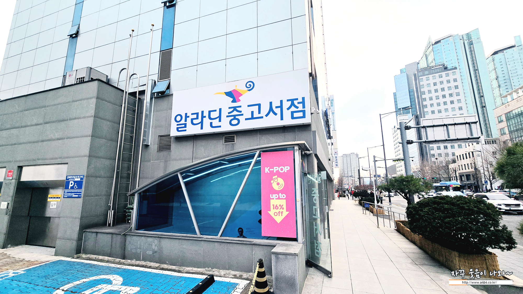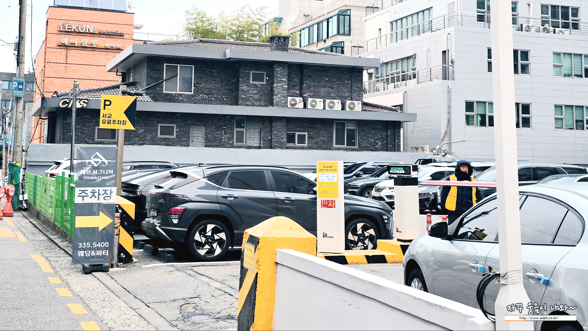 주차장은 건물 왼편에 위치해 있습니다. 왼쪽은 입구, 오른쪽은 출구로 구성되어 있는데요. 건물옆에 장애인 주차장과 카리프트 이용한 지하 주차장도 있는데요.