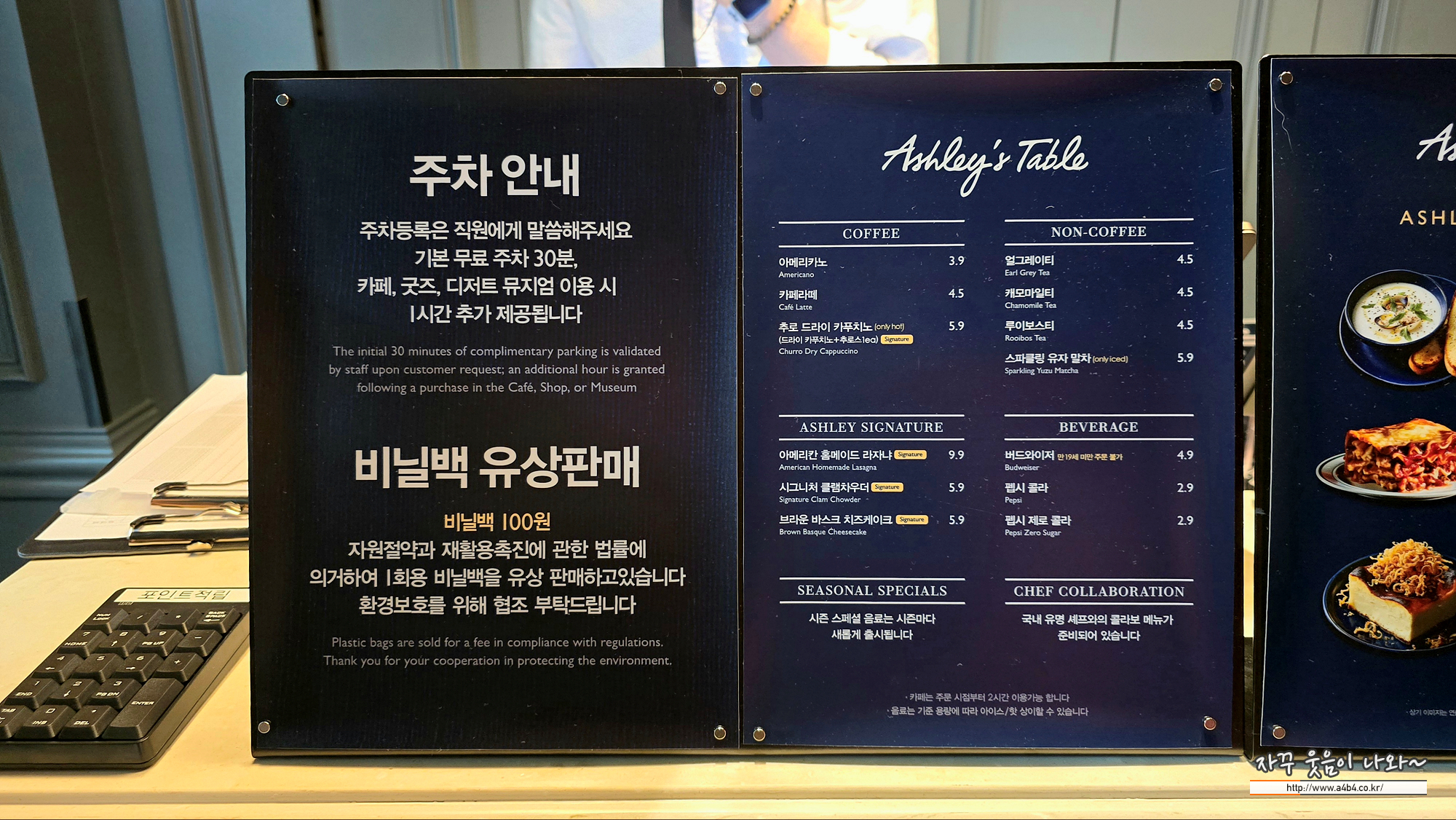 매장 이용시 90분 무료주차가 가능한데, 애슐리 디저트 뮤지엄과 하우스 오브 애슐리 동시 이용 하기에는 무료주차 시간이 다소 아쉬운 (출차하면서 1,000원 인가 주차요금 냈음)