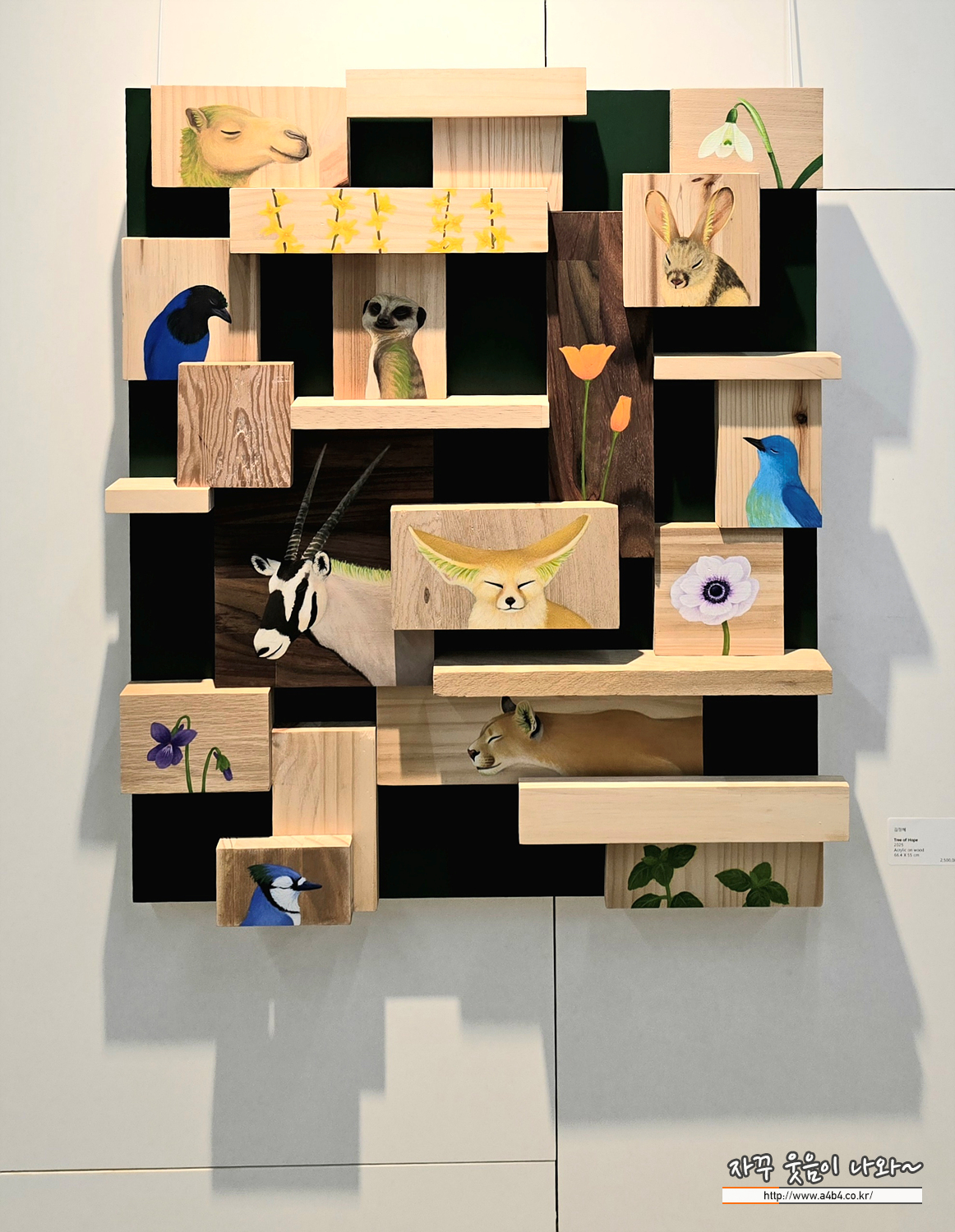 김정혜 작가는 회화 작업뿐 아니라, 가구 제작 후 버려지는 나무 조각들을 모아 각각에 그림을 그리거나 색을 입히고, 이를 하나의 작품으로 구성하는 작업도 병행하고 있는데요. 이번 전시회에서도 'Tree of ~' 연작을 만나볼 수 있습니다.