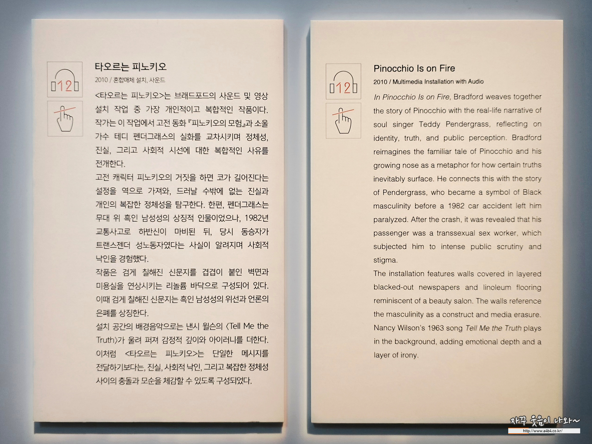 '타오르는 피노키오'는 19세기 고전 소설 속 피노키오와 미국 소울 가수 테디 펜더그래스의 이야기를 교차시키는 작품이다. 흑인 남성성의 상징이던 펜더그래스는 사고로 하반신이 마비되었고, 그 사건은 사회적 파장을 일으키며 정체성과 시선의 문제를 드러낸다.