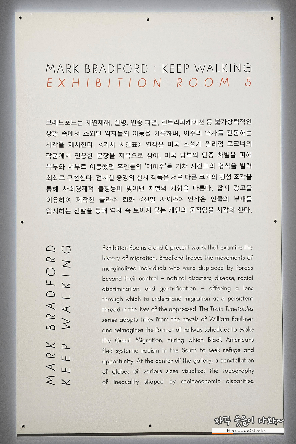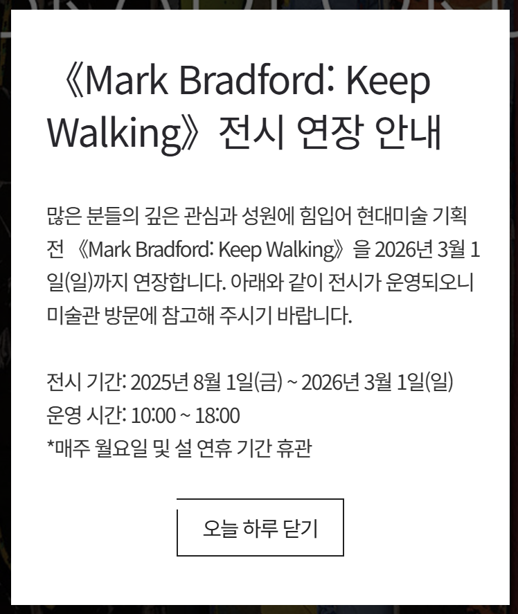 많은 분들의 깊은 관심과 성원에 힘입어 현대미술 기획전 《Mark Bradford: Keep Walking》을 2026년 3월 1일(일)까지 연장합니다. 아래와 같이 전시가 운영되오니 미술관 방문에 참고해 주시기 바랍니다.