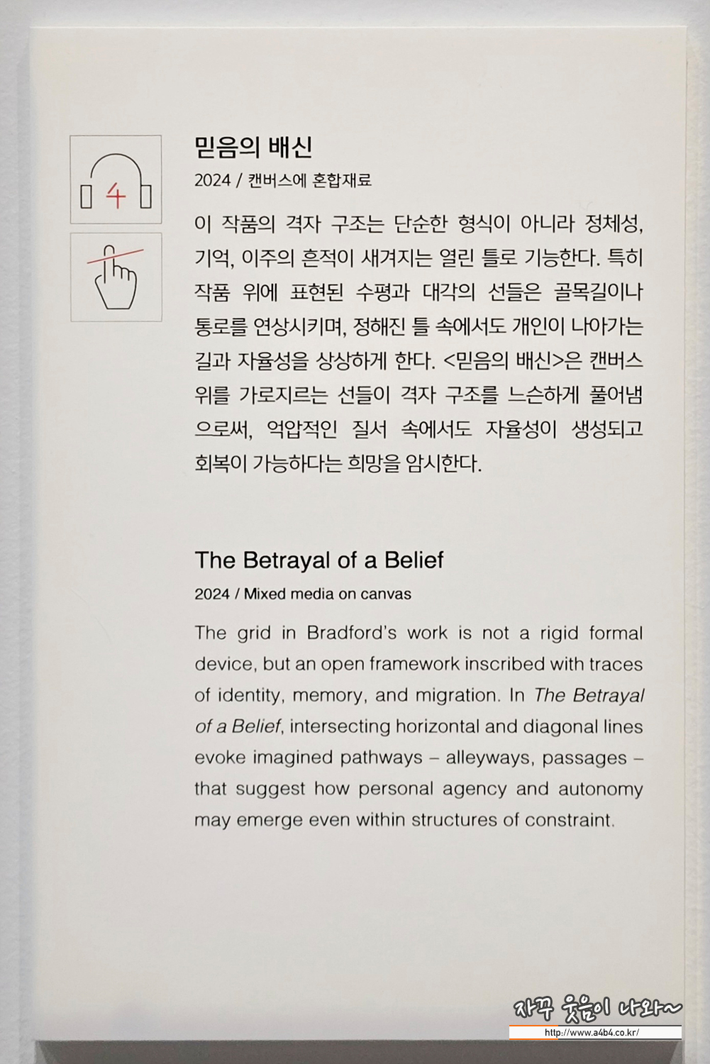 '믿음의 배신'은 엔드페이퍼로 구성된 격자 구조를 기반으로, 캔버스 위에서 교차하는 수평선과 대각선을 통해 질서를 유연하게 풀어낸다. 브래드포드는 얇은 종이를 겹겹이 나열하며 고정된 틀 안에서 개인의 경로가 형성되는 방식을 탐구한다. 작가는 격자를 회화의 종착점이 아닌 출발점으로 삼아 정체성과 이동성의 문제를 반복적으로 다룬다.