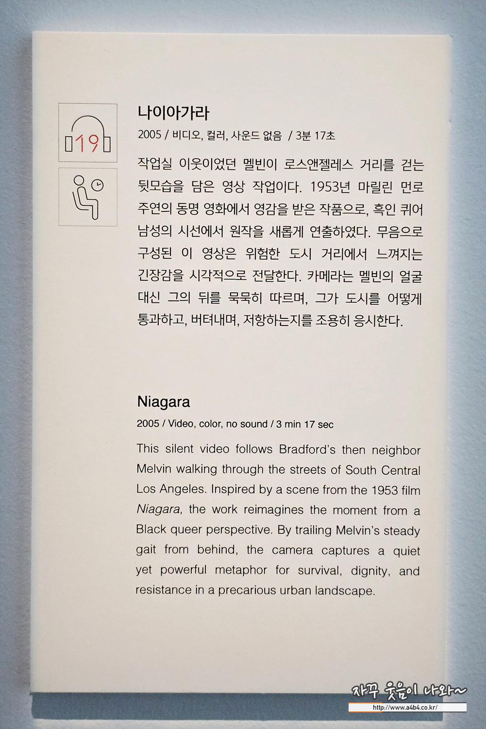 '나이아가라'는 단순한 움직임을 통해 깊은 정서적 울림을 전하는 영상 작품이다. 작가 스튜디오의 이웃이었던 흑인 소년 멜빈은 카메라를 등진 채 로스앤젤레스 거리를 조용히 걸어가며, 이 장면은 3분 길이의 단일 롱테이크로 촬영되었다.