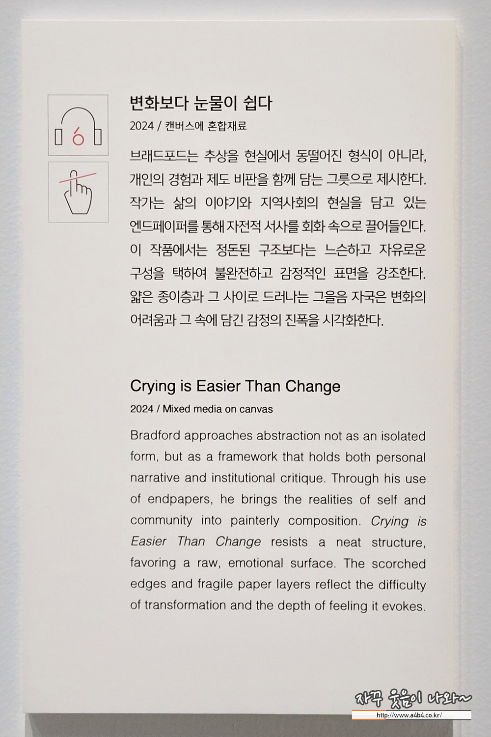 '변화보다 눈물이 쉽다'는 기존 엔드페이퍼 연작보다 한층 느슨하고 자유로운 구성을 보여준다. 작품의 캔버스 표면에는 얇은 종이의 흔들림과 그을린 자국들이 불규칙하게 얽혀 있으며, 변화에 따르는 불안과 저항의 심리를 감각적으로 드러낸다. 작품의 제목은 제임스 볼드윈의 1980년대 인터뷰에서 가져온 것으로, 정해진 틀을 바꾸기보다 눈물을 택하는 인간의 감정적 심리를 함축한다. 브래드포드는 추상을 통해 사회적 구조를 담아내는 동시에, 그 안에 저항하는 감정의 그릇이 될 수 있음을 보여준다.