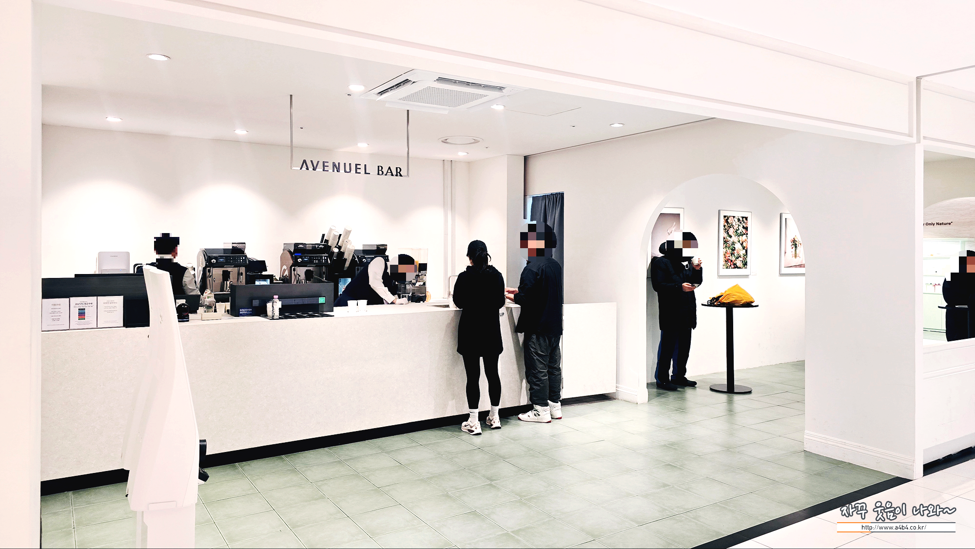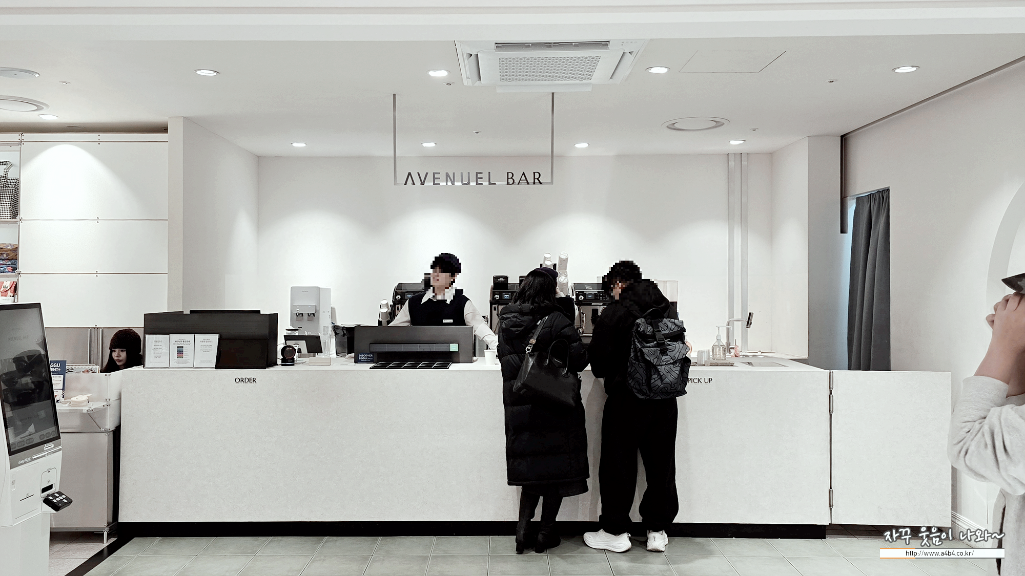 앱이나 QR 보여주시고 주문하시면 되고요. 커피와 라떼, 몇 가지 차 종류와 오렌지 주스 등이 에비뉴엘바 메뉴로 있습니다. 주문 후 진동벨 수령하시고 기다리시면 됩니다. 오래 걸리지는 않아요.