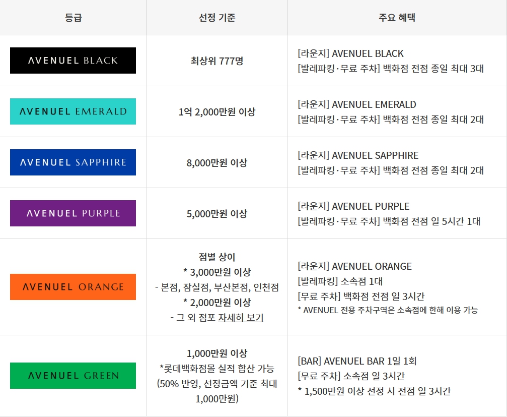 롯대백화점은 최상위 777명 블랙 등급부터 그린까지 6개의 등급이 있고요. 등급에 따라 에비뉴엘 라운지 이용 및 무료주차 가능합니다. 또한 라운지를 이용할 수 있거나 단순히 음료 테이크아웃만 가능하기도 하니 롯데백화점 등급 확인하시고 방문하세요.