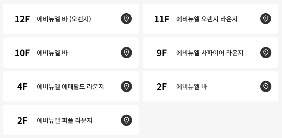 최상 에비뉴엘 에메랄드 라운지는 4층에 가장 낮은 등급의 에비뉴엘바는 2층과 10층에 위치해 있습니다.