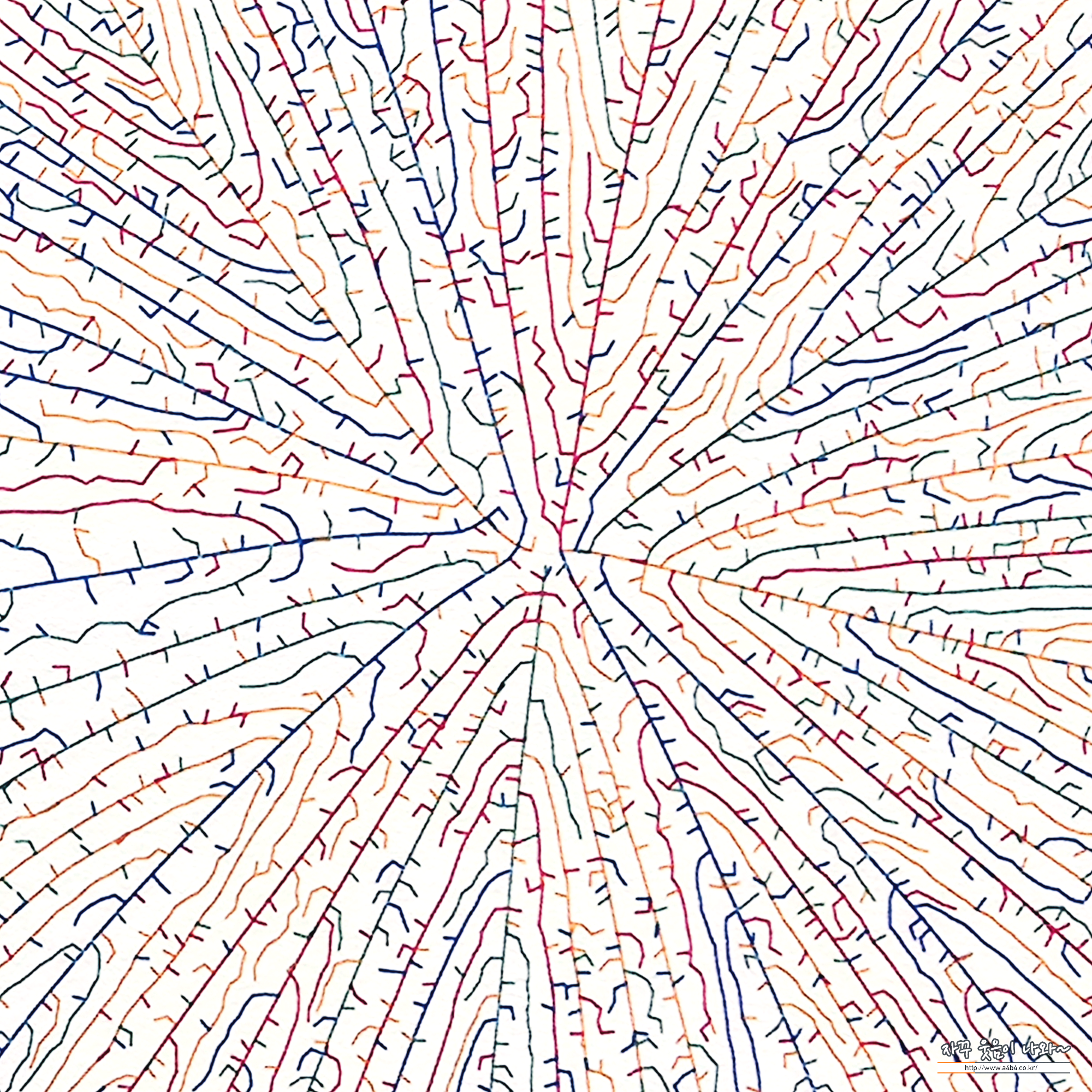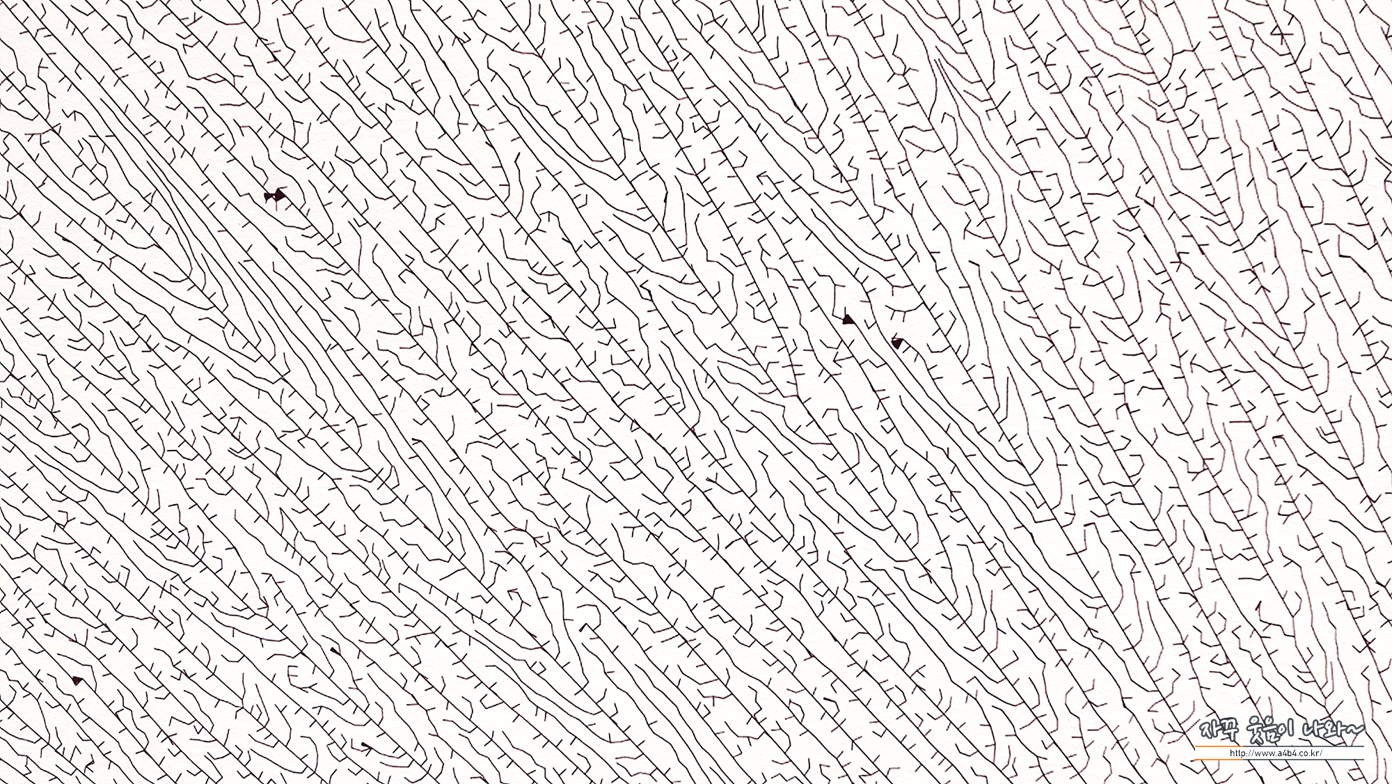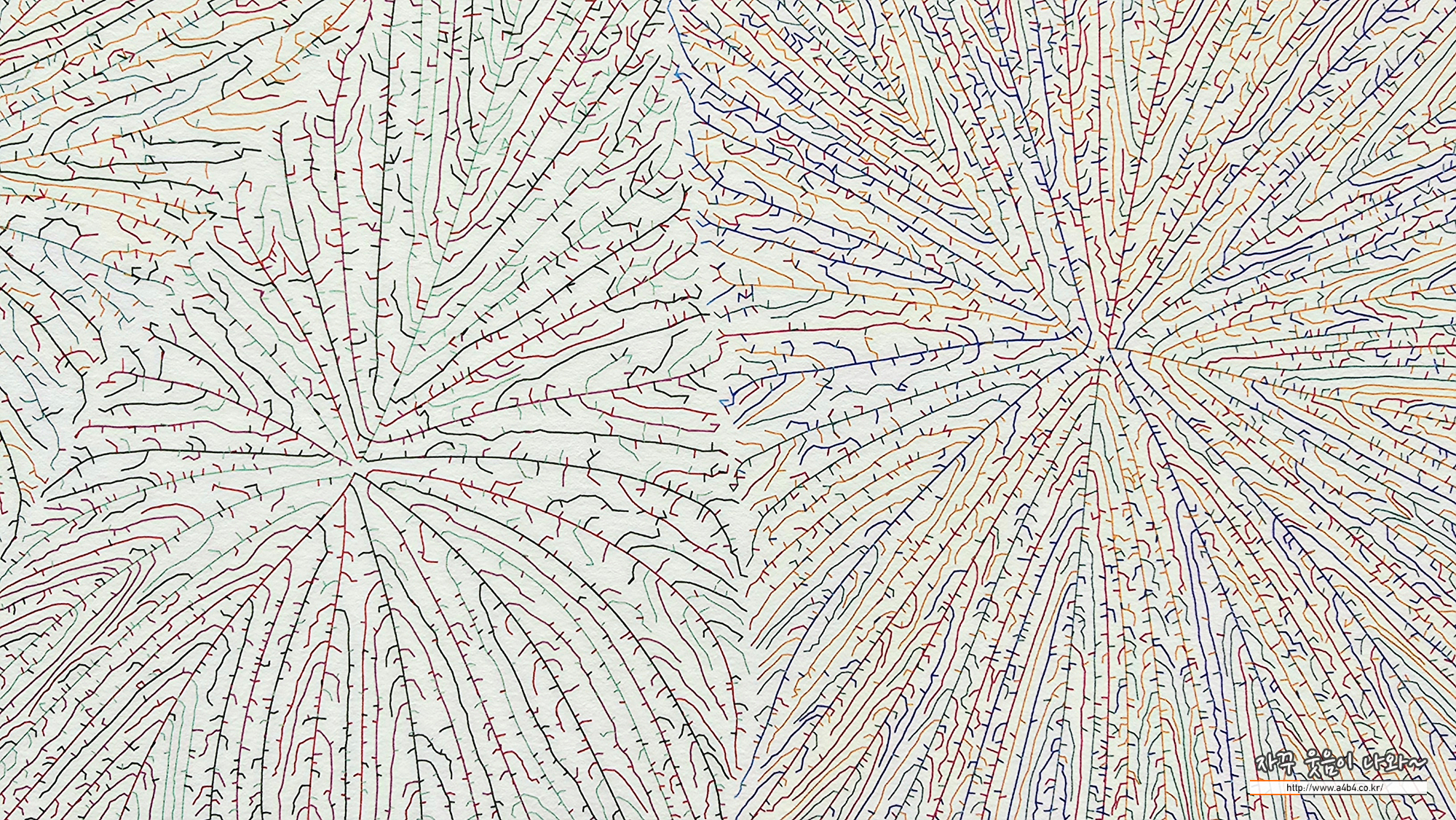 김수정 작가의 'Noise Veins'는 잎맥이나 신경망 같은 자연의 분기 구조에서 출발합니다. 화면 위 선들의 흐름과 밀도는 생명과 정보, 관계의 형성 방식을 은유하며 질서와 우연이 교차하는 자연의 성장을 연상시킵니다. 이번 작업은 디지털 계산 구조를 물질적 매체에 옮기는 과정을 담고 있습니다. 이를 통해 알고리즘과 감각, 자연과 인공 사이의 관계를 탐색하는 실험으로 이어집니다.