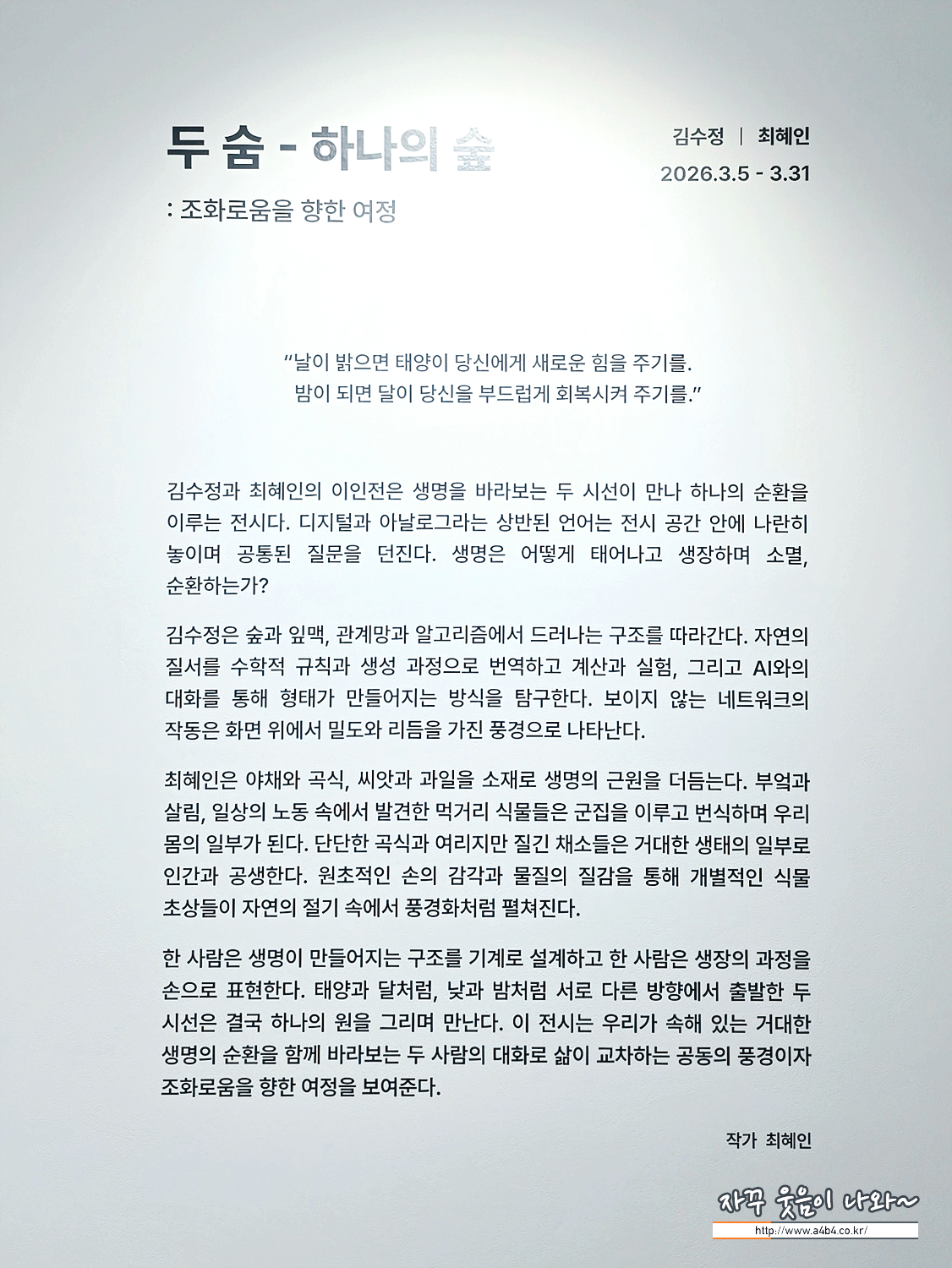 | 최혜인 작가 전시회 '두 숨 - 하나의 숲' (1) | 2026.03.08 |