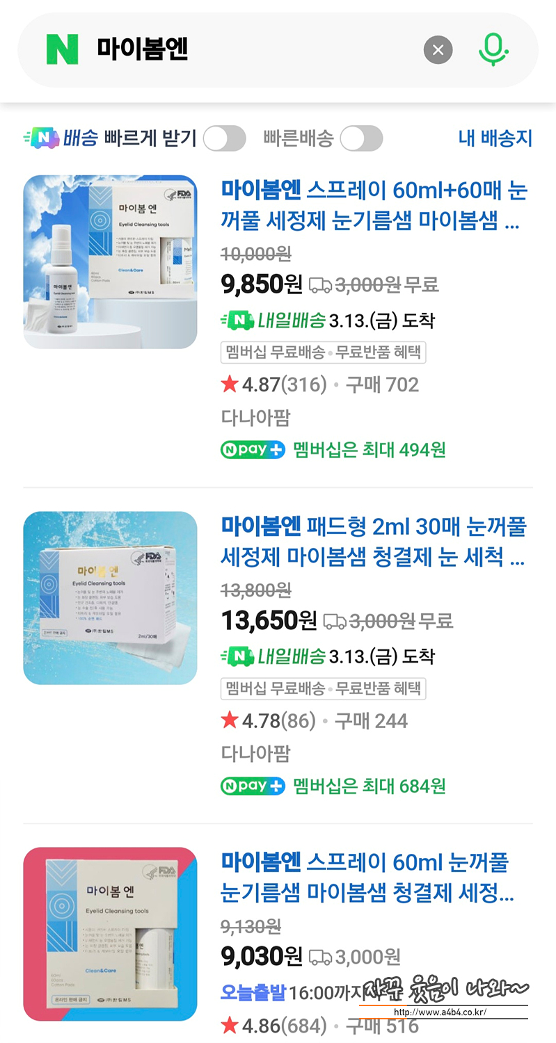 마이봄엔 가격은 온라인에서 배송비 포함 최저가 9,850원에 구입가능합니다. 저는 안과에서 1만원 중반 가격에 구입한 것 같고요.