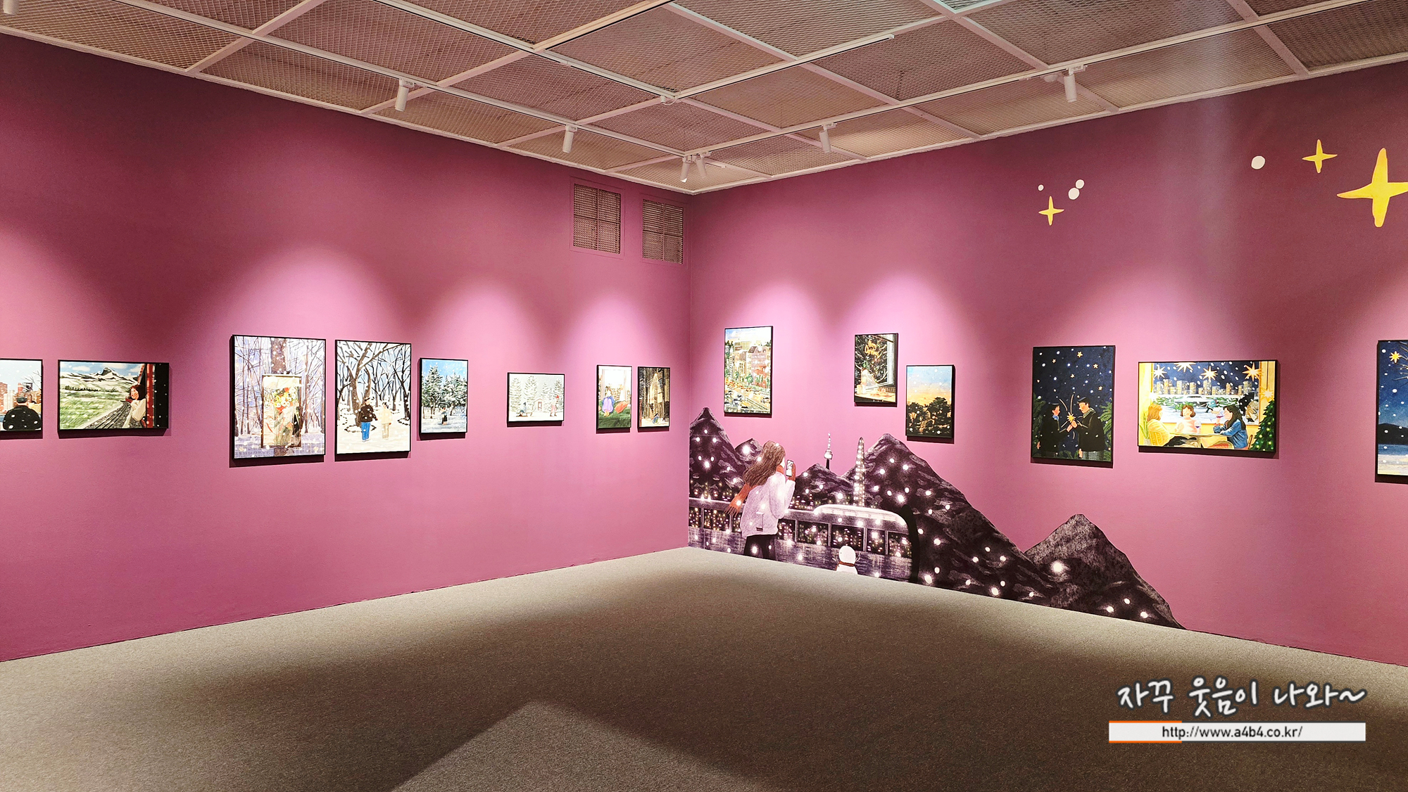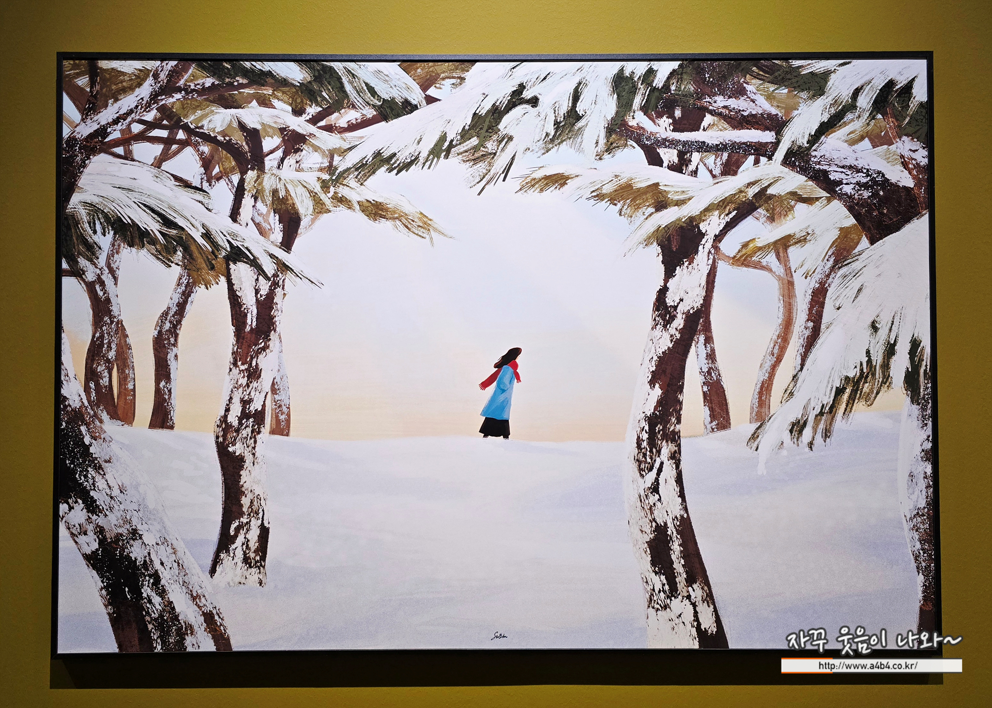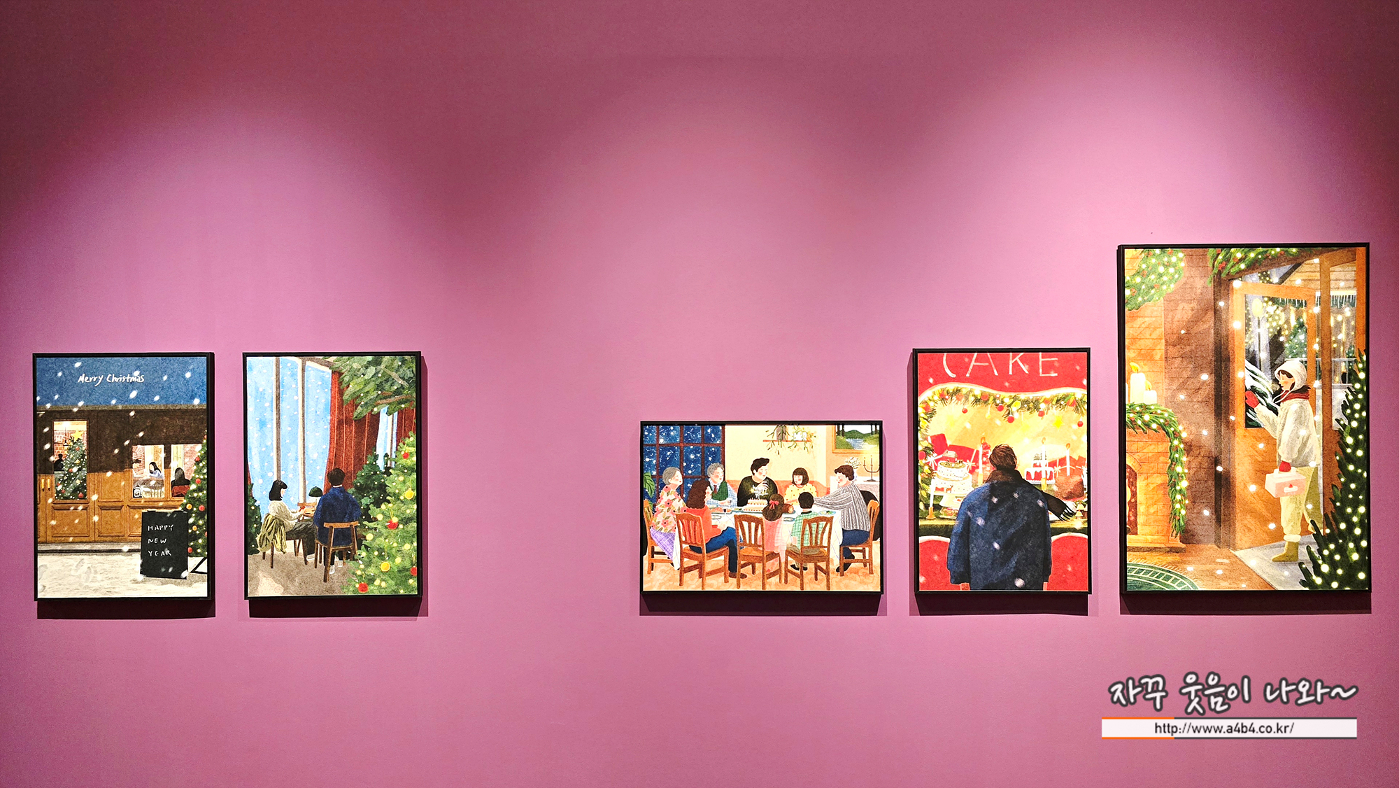 겨울,그 따뜻한 순간들 전시회 전시장 구성은 중앙에 대형 포토월이 설치되어 있고 수빈, 배성규, 아레아레아 작가 3명의 작품이 전시된 각각이 방으로 구성되어 있습니다. 어느 방부터 먼저 들어가도 방은 모두 연결되어 있고요. 배성규 작가 또는, 아레아레아 작가 방에서 시작하시면 연속해서 관람이 가능합니다.