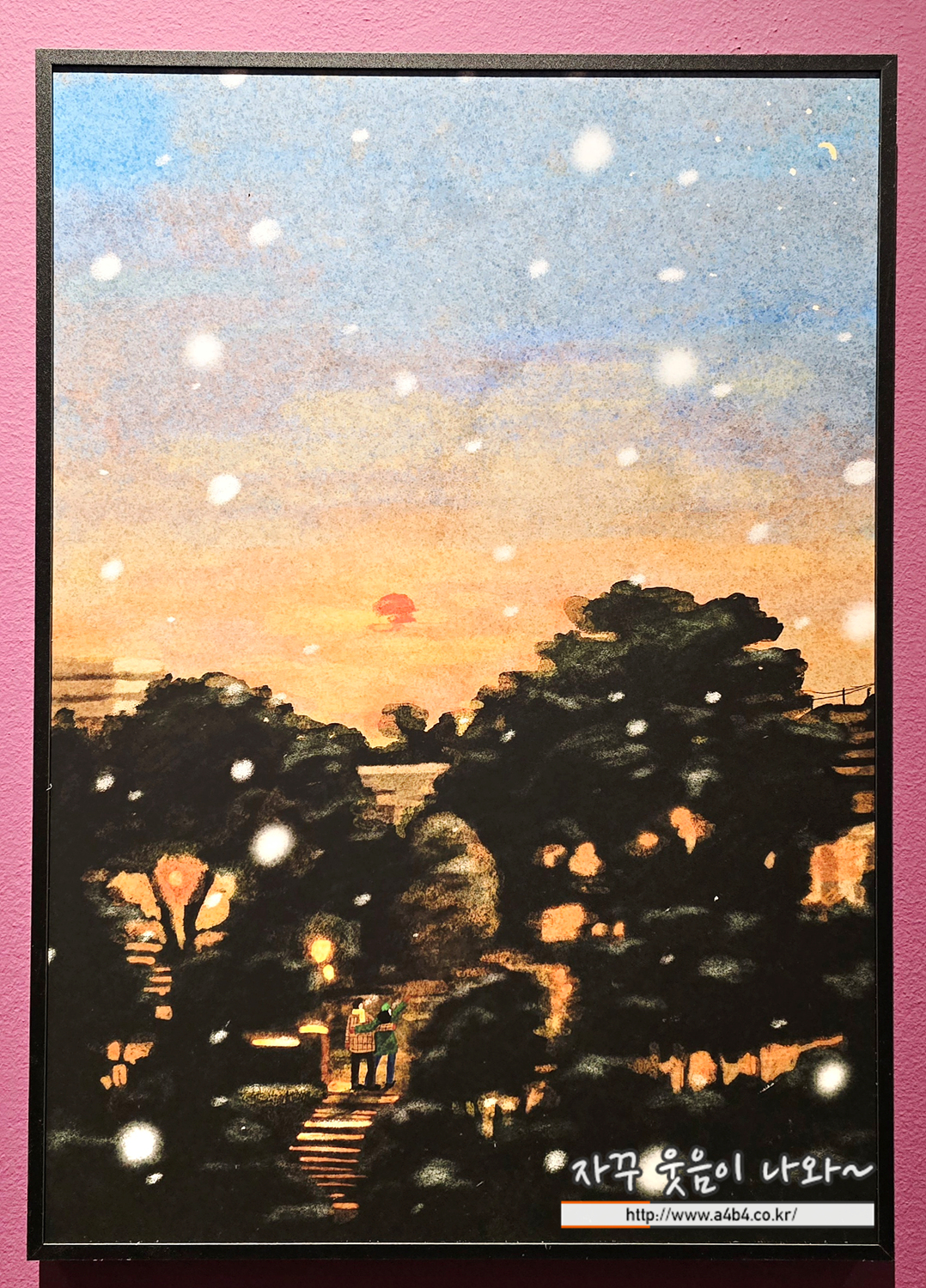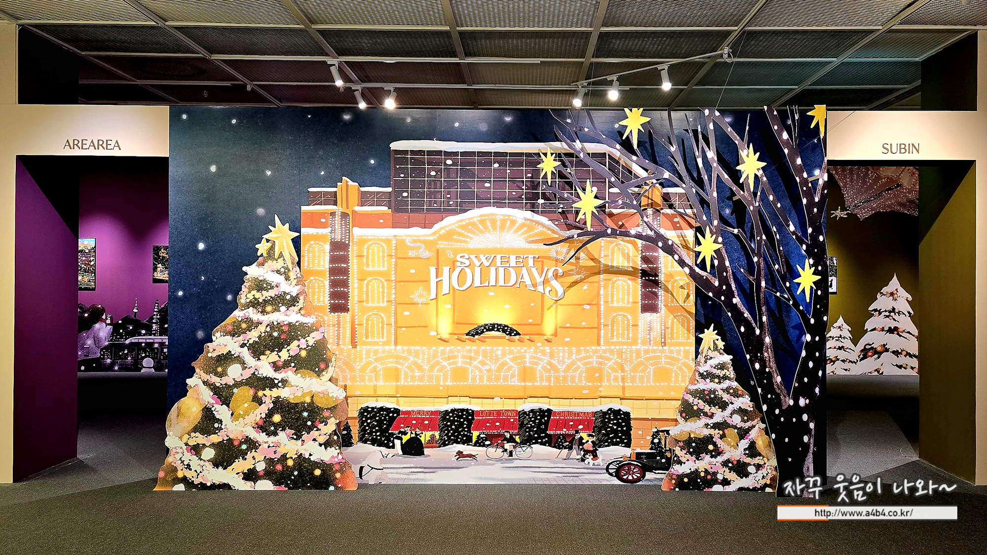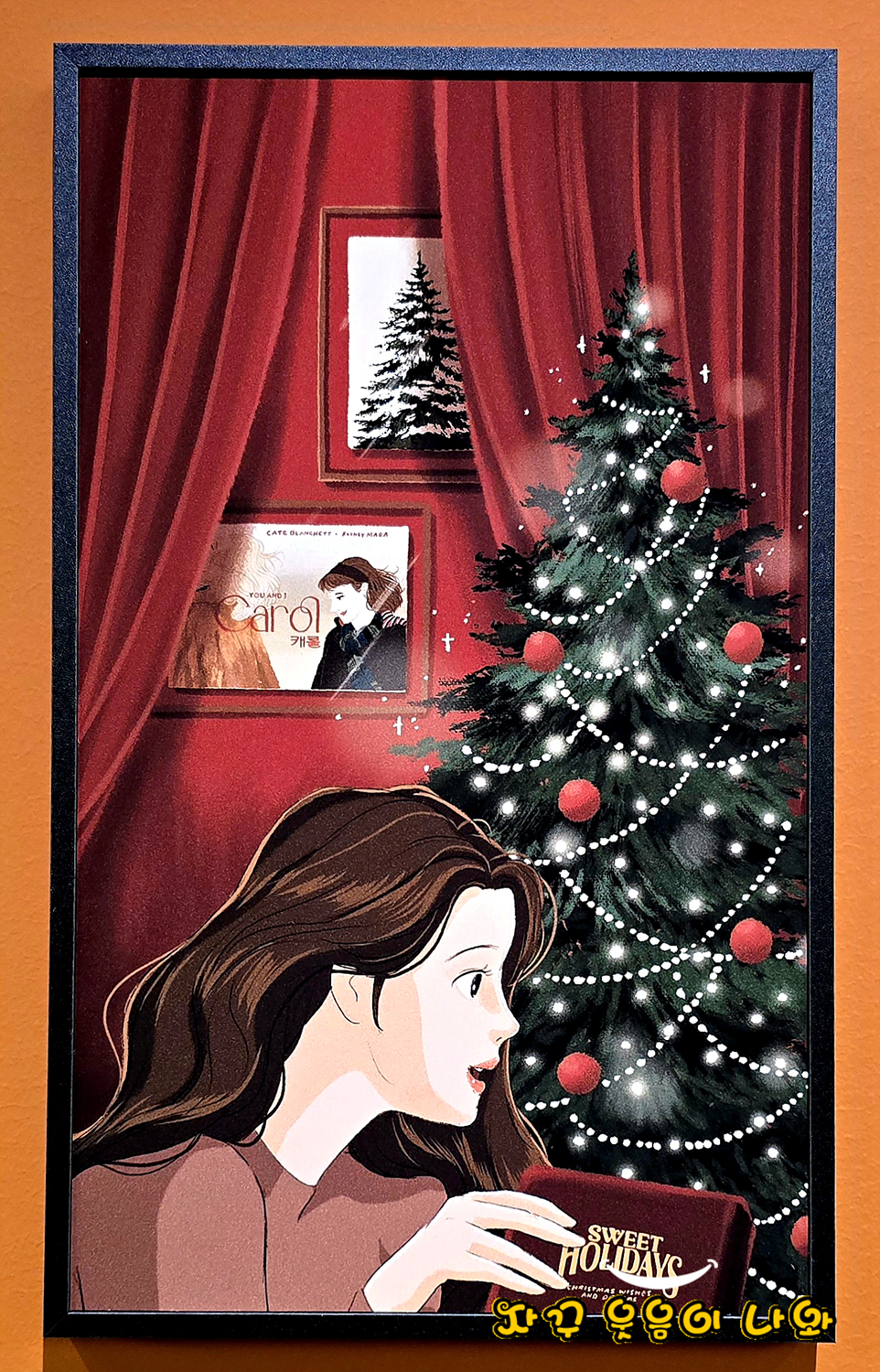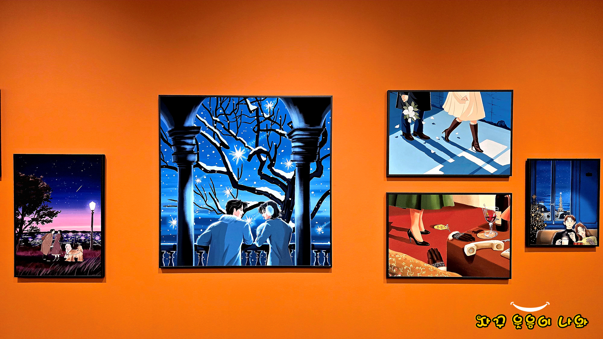 겨울,그 따뜻한 순간들 전시회 전시장 구성은 중앙에 대형 포토월이 설치되어 있고 수빈, 배성규, 아레아레아 작가 3명의 작품이 전시된 각각이 방으로 구성되어 있습니다. 어느 방부터 먼저 들어가도 방은 모두 연결되어 있고요. 배성규 작가 또는, 아레아레아 작가 방에서 시작하시면 연속해서 관람이 가능합니다.