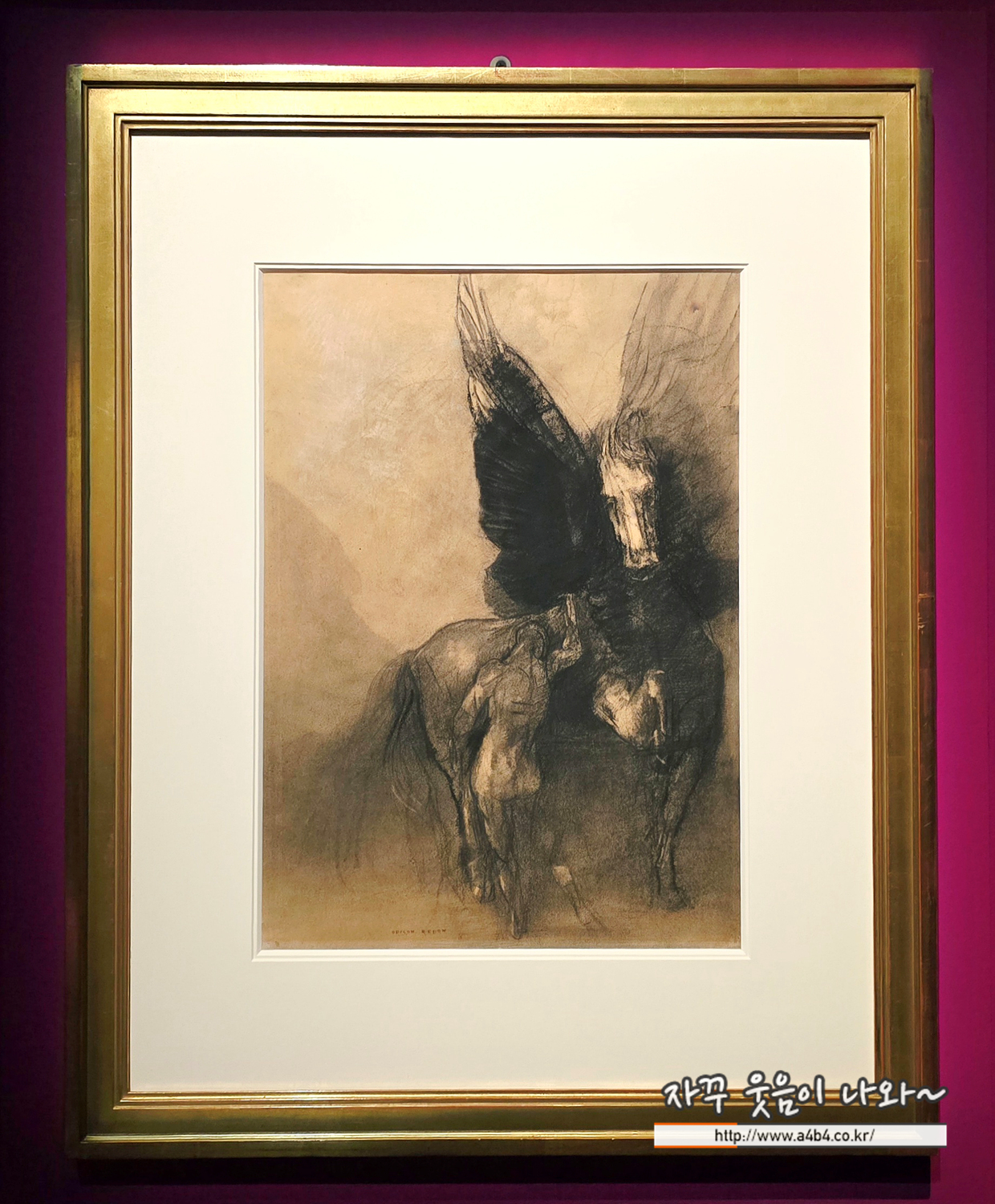 상징주의 화가 오딜롱 르동은 자신이 그린 목탄화를 프랑스어로 ‘누와르’(noir, 검은색)라고 불렀다. 그는 이 작품에서 날개 달린 말 페가수스와 그의 주인 벨레로폰을 그렸다. 벨레로폰은 페가수스 옆구리에 기대며 부드럽게 다루고 있다. 벨레로폰보다 크게 묘사된 페가수스는 종이 바깥까지 날개를 활짝 펼치고 있다. 어둡게 칠한 그림자 속에서 형태가 드러나는 부분만 밝게 칠해 명암의 대비를 강조했다.