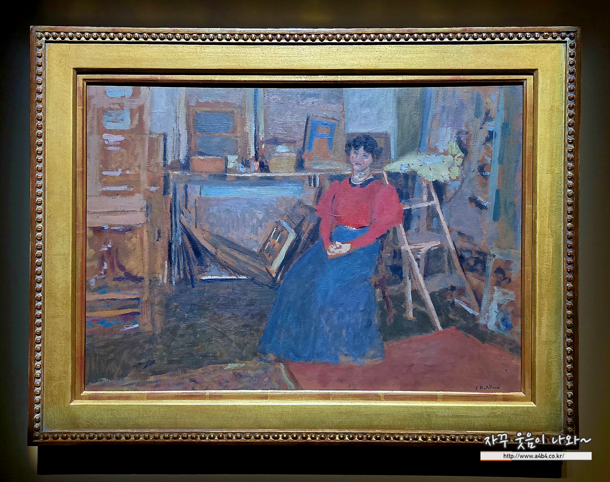 에두아르 뷔야르는 실내 초상화를 많이 남겼다. 주로 친구, 가족, 부르주아 계층을 그렸다. 여성이 입은 부풀린 소매의 빨간색 블라우스와 푸른색 긴 치마는 1890년대 유행하던 옷차림이다. 뒤로는 다양한 작품을 놓은 선반이 있고, 위 칸에는 그림 액자를 무심히 기대어두었다. 액자, 선반, 사다리의 가로대 등 여러 사각형 형태로 채워진 배경에서 기하학적인 리듬감이 느껴진다.