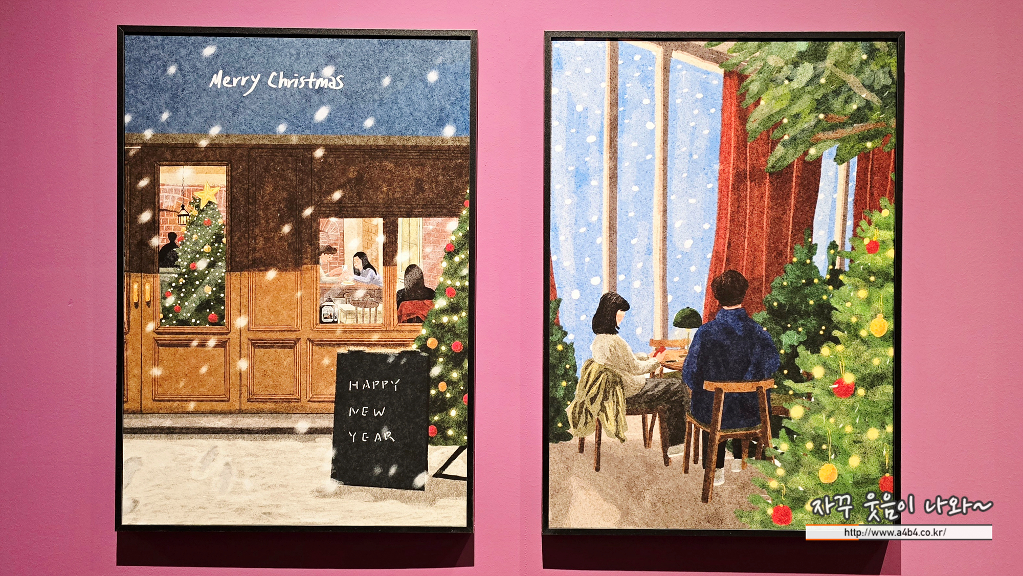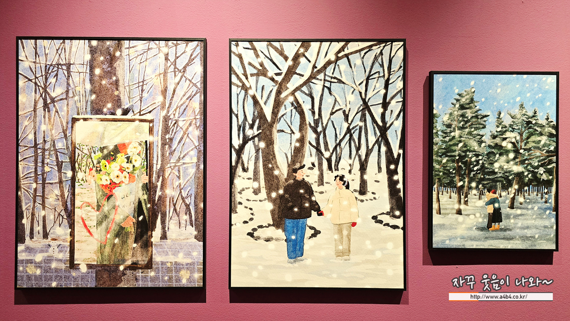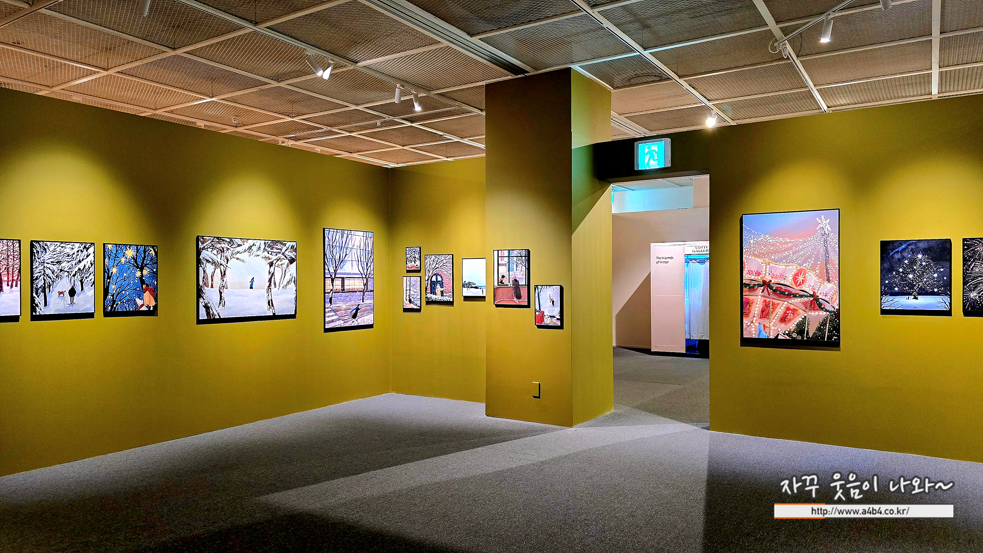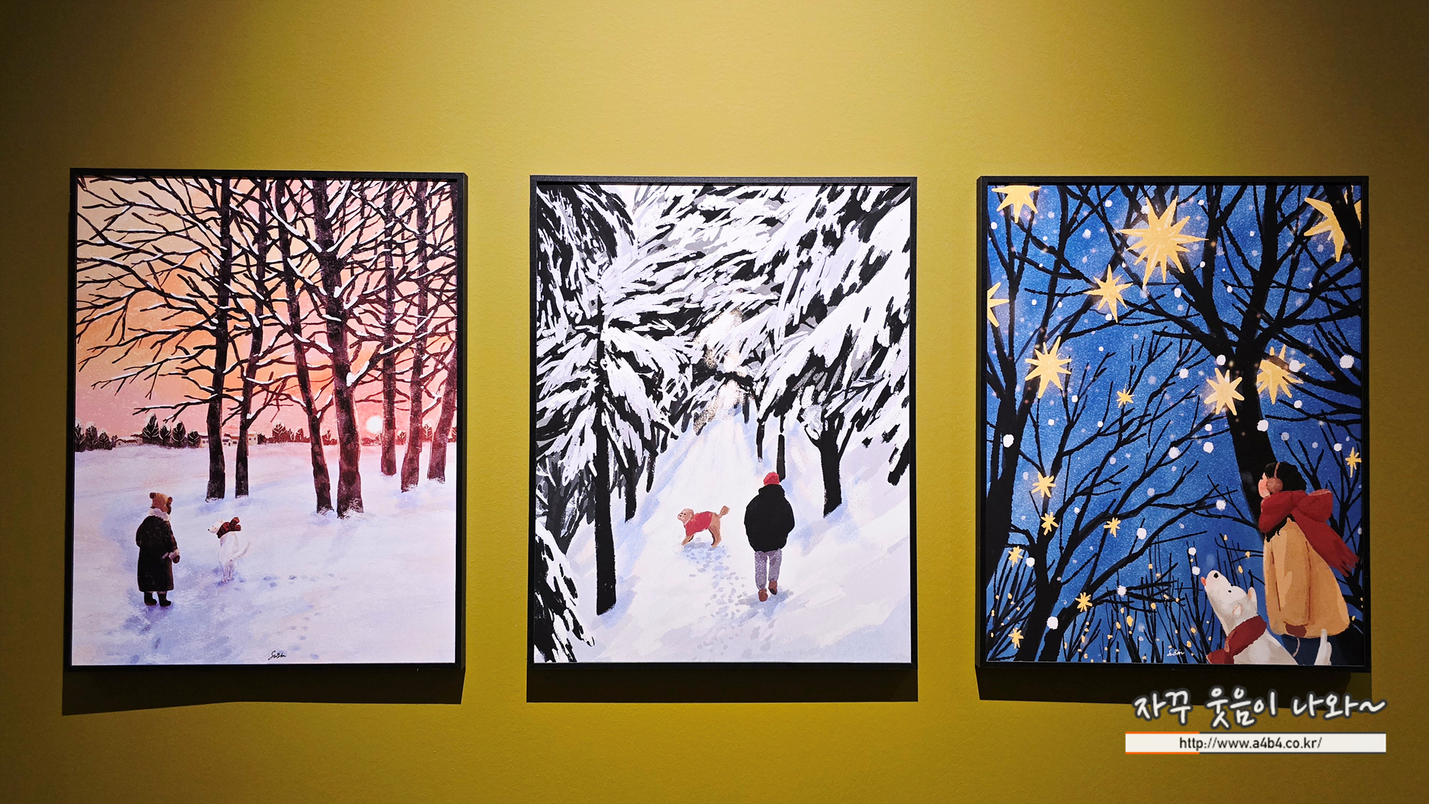 지난주 금요일부터 잠실 롯데월드몰 6층에 위치한 에비뉴엘아트홀 전시회 '겨울,그 따뜻한 순간들' 관람후기 입니다. 이번 전시회는 겨울을 주제로 국내에서 활발하게 활동하고 있는 일러스트레이터 3인의 작품을 만나볼 수 있습니다.