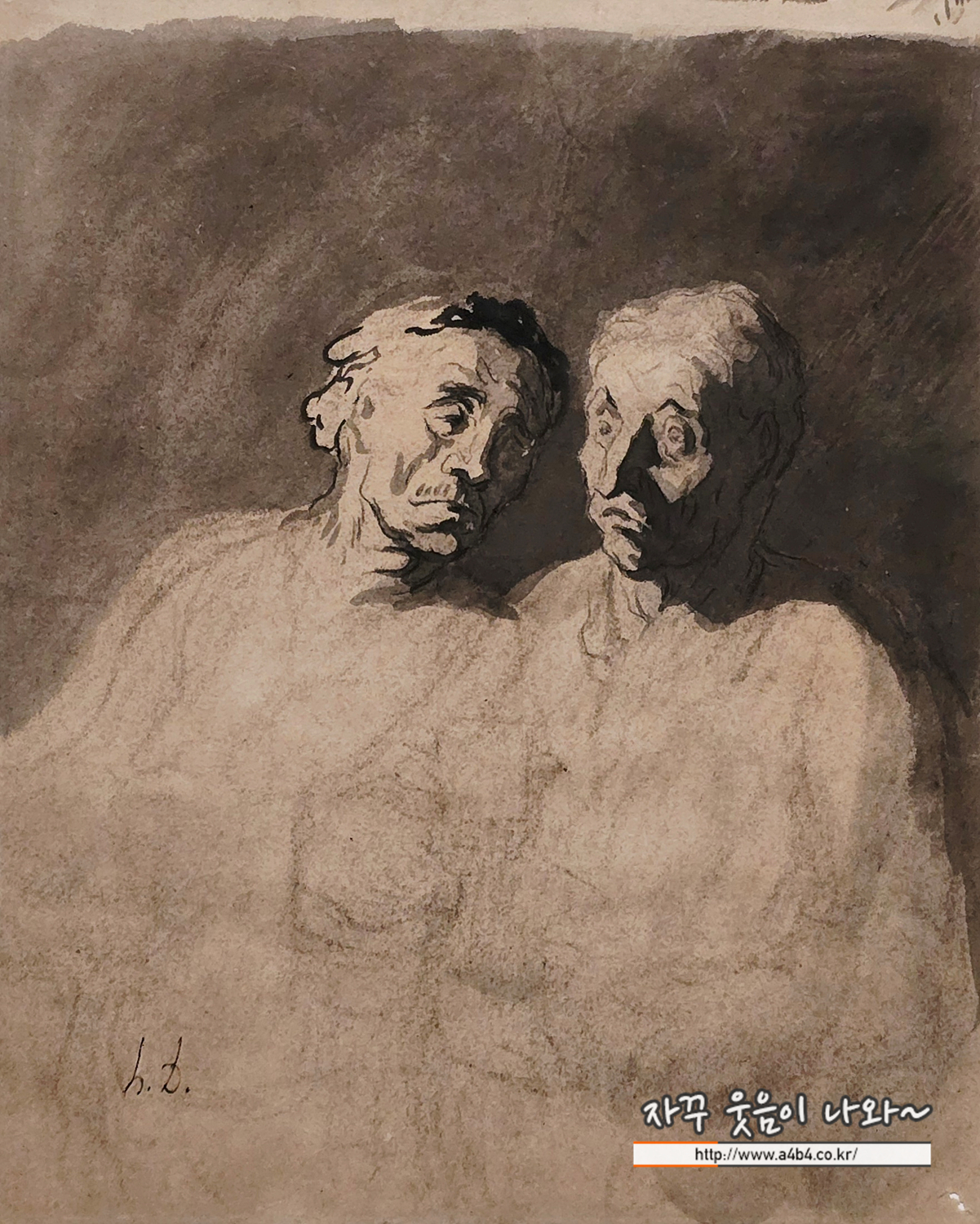 오노레 도미에는 19세기 중반 프랑스의 모습을 활기찬 드로잉과 캐리커처로 표현했다. 나이 든 술꾼들을 그린 두 작품처럼, 도미에는 인간의 사회적 유형을 탐구하며 표정과 행동을 묘사한 수많은 그림을 남겼다. 한 그림에서는 지친 듯 우울해 보이는 남성이 멍하니 있는 친구 쪽으로 몸을 기대고 있다. 다른 그림은 도미에가 복잡한 선을 활용한 방식을 잘 보여준다. 한 남성은 이야기하던 중인 듯 가슴을 내밀고 입을 벌리고 있고, 다른 남성은 팔을 기대며 술잔을 들고 있다.