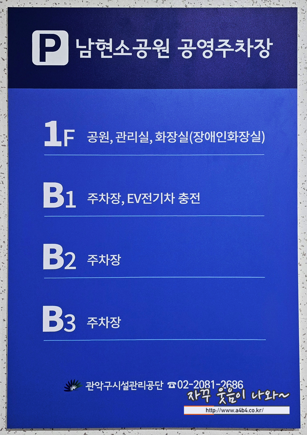 서울시립 남서울미술관 주차장으로 추천하는 사당역 남현소공원 공영주차장은 총 4개 층으로 구성되어 있습니다. 1층은 관리실과 공개 화장실이 있으며, 주차장은 지하 3층부터 1층까지 엘리베이터로 이동이 가능합니다.