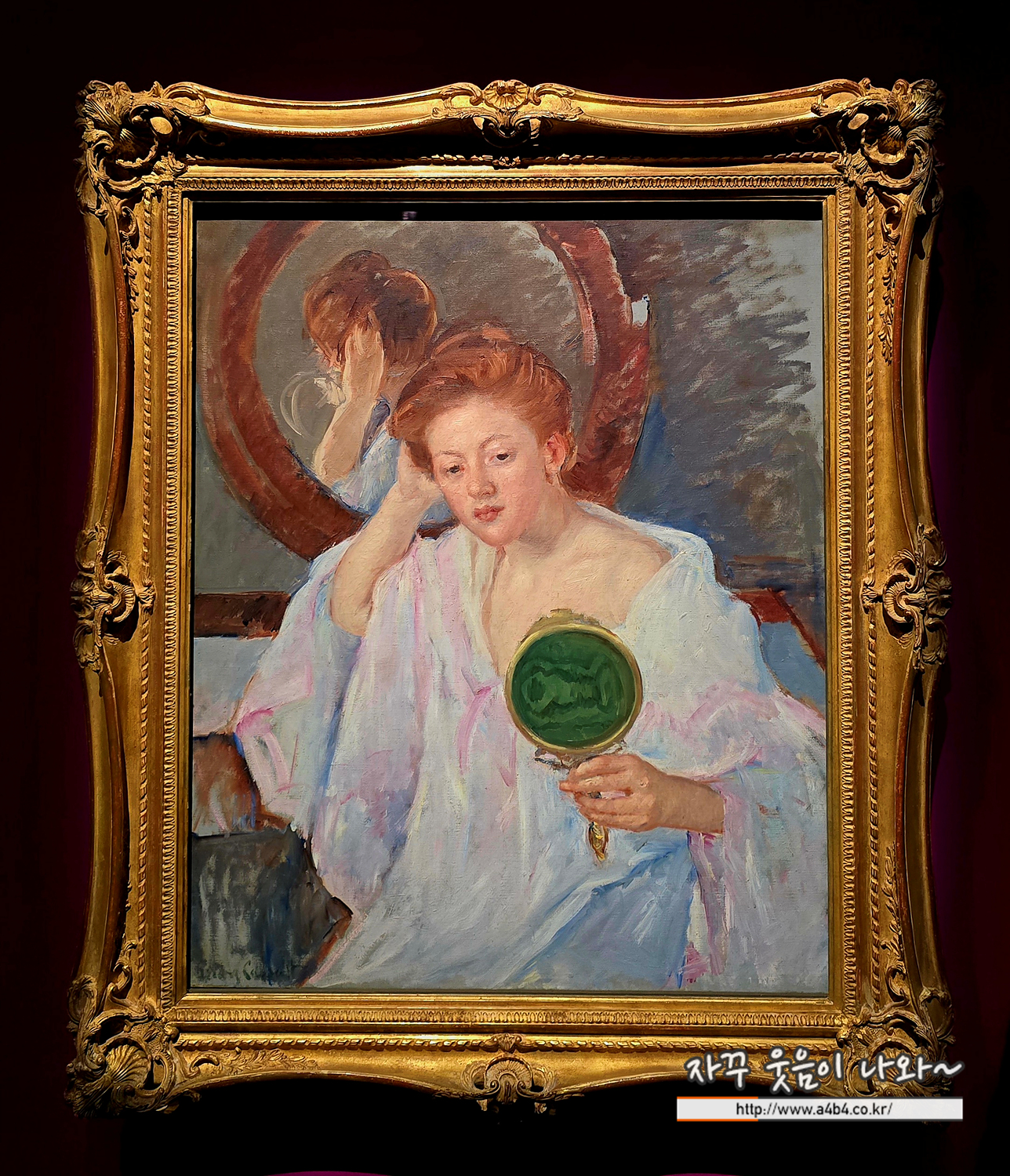 ‘거울을 보는 여성’은 허영심과 자기 성찰이라는 주제로 오랫동안 다뤄져 왔으며, 메리 커샛은 이 고전적 주제를 현대적 감각으로 재해석했다. 작품 속 주인공 드니즈는 옅은 분홍색으로 가장자리를 덧칠한 흰색 가운을 입고, 한 손에 손거울을 들고 있다. 당시 유행하던 올림머리를 했고, 뒤쪽 화장대 거울에 머리 뒷모습이 비친다. 커샛은 말년에 시력이 나빠져 작업을 거의 하지 못했지만, 얼굴 세부와 몸, 가운의 표현, 섬세한 색채 조절에서 여전히 능숙한 솜씨를 보여준다.