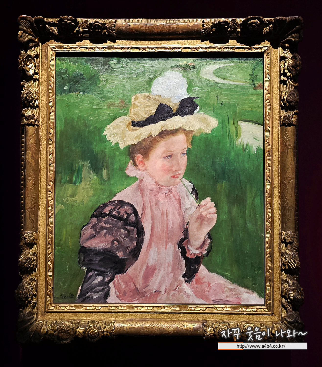 메리 커샛은 프랑스 인상주의 화단에 완전히 스며든 유일한 미국인이었다. 그녀는 당대 부르주아 계층 여성의 다양한 삶을 그려 독자적인 예술 세계를 구축했다. 이 작품에서 커샛은 교외로 나가 시간을 보내던 한 소녀의 여가 활동에 주목했다. 이는 파리 북서쪽에 살던 그녀에게 익숙한 장면이었다. 깊이감 없는 평면적인 풍경과 아래를 향한 시점은 일본 판화의 영향을 보여준다. 여성의 삶을 섬세한 관찰력과 심리적 깊이로 진지하게 다뤘다는 점에서 높은 평가를 받았다.