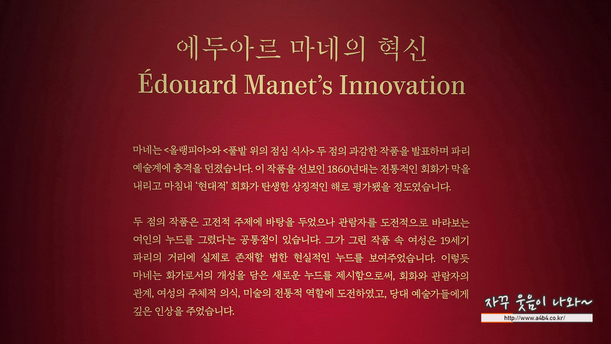 두 점의 작품은 고전적 주제에 바탕을 두었으나 관람자를 도전적으로 바라보는 여인의 누드를 그렸다는 공통점이 있습니다. 그가 그린 작품 속 여성은 19세기 파리의 거리에 실제로 존재할 법한 현실적인 누드를 보여주었습니다. 이렇듯 마네는 화가로서의 개성을 담은 새로운 누드를 제시함으로써, 회화와 관람자의 관계, 여성의 주체적 의식, 미술의 전통적 역할에 도전하였고, 당대 예술가들에게 깊은 인상을 주었습니다.